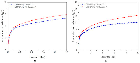 CO2 adsorption isotherms at 25 °C for the CPO-27-Mg degassed at 330 °C and CPO-27-Mg-F25 degassed at 190 °C up to (a) 1 bar and (b) 10 bar of pressure.