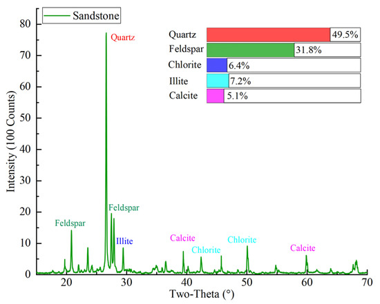 The yellow sandstone for the work was sampled from the slope of an open pit mine in Urumqi, China. The selected yellow sandstone is a common sedimentary rock in the Xinjiang region of China. At the same time, the Xinjiang region belongs to the seasonally cold areas and the rock structures are susceptible to F–T weathering. Homogeneous blocks of the sandstone were selected to machine cylindrical samples with a diameter of 50 mm according to ISRM recommendations. Two aspect ratios were machined, namely, 1 for dynamic tests and 2 for static tests (see Figure 1). The lateral surfaces of the samples need to be vertical and smooth, with no significant structural surfaces. In addition, both ends of the samples were ground to a tolerance of 0.02 mm [8]. Then, the dry density and longitudinal wave velocity of the samples were measured to select samples with similar wave velocity and density for this study. A total of 54 samples were selected for the dynamic tests and divided into three groups for the F–T tests. Moreover, 21 samples with a length of 100 mm were selected to conduct static tests. To maximize spatial resolution, samples with a diameter of 20 mm were chosen for the CT scanning tests. Three static samples were selected for the basic physico-mechanical tests. The results are listed in Table 1. The main mineral composition of the sandstone was determined by X-ray diffraction tests (Bruker AXS, Karlsruhe, Germany, product model D8-A), and the results are presented in Figure 2.