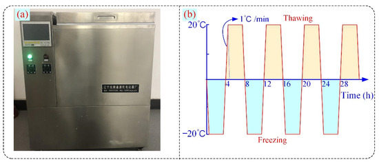To accelerate the weathering process, a rapid F–T chamber (Liaoning Fushun Instrument Co., Ltd., Fushun, China, product model QDR-50) was used in this study (see Figure 3). The chamber can operate in a temperature range of −30 to 80 °C with a control accuracy of ±0.5 °C. The cyclic F–T number in this study was set to 0, 5, 10, 20, 30, and 40 times according to the temperature variations in the cold areas. According to ASTM D5312, the F–T process was performed with a cycle of −20 °C freezing for 4 h and 20 °C thawing for 4 h. In this work, only saturated sandstone was tested for F–T cycles.