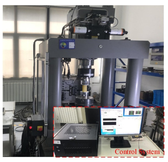 In this study, static uniaxial compression tests were performed on the freeze–thawed samples using the MTS816 system (MTS USA, Inc. Minneapolis, MN, USA), as shown in Figure 5. The MTS816 system measured the axial displacement of the samples via a linear variable displacement transducer (LVDT), recorded the axial load, and determined the stress–strain relationship of the specimens. To better control the loading process, the displacement control method was used during the test and the displacement rate was set to 0.1 mm/min to meet the requirements of quasi-static loading.