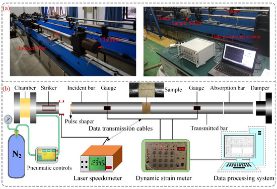 SHPB experimental system (a) and detailed schematic diagram (b).