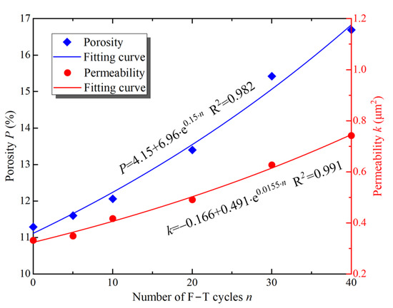 As shown in Figure 8, based on the 3D reconstruction model, the variation of porosity and permeability of the samples was calculated using Equations (1) and (2). Porosity and permeability are closely related to the nature of the rock and are important parameters to describe the pore network in the rock. As seen in Figure 8, porosity and permeability of the samples increase with F–T cycles, and the exponential function can describe the changes of the parameters well. After 40 F–T cycles, the porosity increased to 16.25%, which is 1.3 times higher than the samples without F–T action. Similarly, the permeability of the samples subjected to 40 F–T cycles increased by 128% to 0.742 μm2. The increased porosity and permeability of the sample provides favorable conditions for migration of water and heat during freezing or thawing, which in turn promotes damage to the rock by F–T action. As a natural material, rocks indeed contain a large number of pores and microcracks. The pore water turns into ice at low temperatures, causing volume expansion. When the pore ice does not have enough space to expand freely, frost heaving will occur [4]. At the same time, the pores and microcracks are gradually enlarged by the frost heaving force. During thawing, pore water flows through the microcracks into other pores, and at this time, the microcracks play the role of seepage channels. For this reason, the microcracks are also called throats. In addition, the water in the rock promotes the expansion of the pores and microcracks through lubrication, erosion, hydrolysis, and F–T action [29]. Meanwhile, some isolated pores develop into interconnected pores through throats. Therefore, the porosity and permeability of the sample simulated with XLabSuite increase with the F–T action. In addition, the increase in porosity and permeability also means an increase in defects in the samples, which leads to a deterioration of the mechanical properties under load.