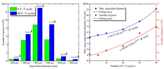 Distribution of the pore equivalent diameters (a) and the maximum and total number of pores (b) with F–T cycles.