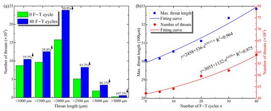 Distribution of the lengths (a) and the maximum lengths and total number (b) of throats with F–T cycles.