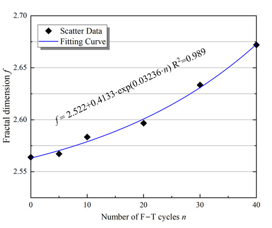 To describe the influence of F–T action on the internal microstructural features of the sample, fractal theory, which responds to the spatial occupancy of complex shapes, was introduced as a measure of irregular, nonlinear shapes [30]. Therefore, the fractal theory is used to quantify the evolution of microstructure in rocks under F–T cycles using 3D CT technology. The fractal dimension is the most important parameter to describe the fractal. In general, the fractal dimensions mainly include the Hausdorff dimension, the assignment dimension, the box dimension, and the similarity dimension [31]. The box dimension is widely used because of its clear physical meaning [12]. In this study, the box dimension was used; that is, the 3D pore model of the sample was placed in a series of cubes with a grid side length ε. The number of grids containing pores or cracks in the cubes was P(ε), and a series of P(ε) was obtained by continuously adjusting the dimensions of the small grids. Then, the slope of the regression line is obtained using double logarithmic coordinates for P(ε) and ε. The fractal dimension f, which corresponds to the edge length ε of the grid, is therefore given in Equation (5). Using the fractal dimension module in Avizo, the fractal dimension f of the central region was determined under F–T action [26]. The results are shown in Figure 11.