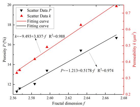 As seen in Figure 11, the 3D fractal dimension of the samples ranged from 2.57 to 2.70, and the variation of the fractal dimension corresponded to the exponential function, which was consistent with the analytical results of porosity, permeability, and pore parameters. The greater the cyclic F–T damage, the larger the fractal dimension of the sample and close to 3. After 40 F–T cycles of the sample, the fractal dimension increases by 4.1%, from 2.574 to 2.679. During the test, the microstructure of the sample (pores or microcracks) gradually develops due to the F–T action, and the spatial distribution becomes more complex, suggesting that the pores are interconnected by throats to increase the spatial occupancy capability. The larger the fractal dimension, the greater the F–T damage to the internal microstructures of the sample. Thus, it is reasonable to characterize the damage to the sandstone microstructure by the fractal dimension. In addition, Figure 12 shows the relationship between the fractal dimension f and the porosity P, and permeability k of the samples under different cyclic F–T action.