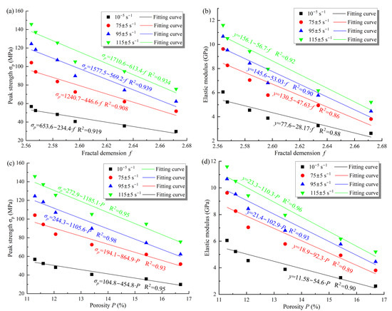 Connection between mechanical properties and microscopic parameters of samples. (a) Peak strength vs. fractal dimension; (b) elastic modulus vs. fractal dimension; (c) peak strength vs. porosity; (d) elastic modulus vs. porosity.