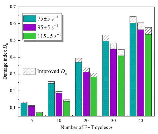 According to Figure 7c, the apparent volume and defect volume of the sample can be determined using the 3D visualization results. As shown in Equation (1), the porosity variation of the sample was calculated based on the defect volume and apparent volume [26]. Therefore, the damage index Dn of the sample was calculated using Equation (8), as presented in Figure 16. From this, it is evident that the improvement factor increases the Dn, which is due to the fact that the value of α gradually decreases to less than 1. Moreover, for the same F–T cycles, the strain rate is negatively correlated with the F–T damage, i.e., the larger the strain rate, the smaller the value of Dn.