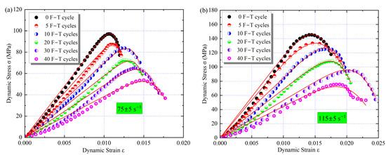 Measured and fitted stress–strain curves at different strain rates and F–T cycles. (a) 75 ± 5 s−1; (b) 115 ± 5 s−1.