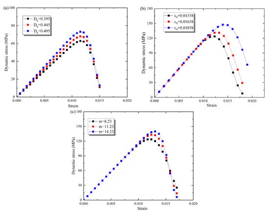 The parameters ε0 and m in the damage evolution model can be ascertained by fitting the stress–strain curves using Equation (14) (see Figure 17). The stress–strain curves under cyclic F–T effects were selected for the parametric study. As shown in Figure 18a, different Dn correspond to different stress–strain curves, and their peak stresses are inversely proportional to the parameter Dn. As the name implies, the higher the damage, the lower the peak stress. Figure 18b illustrates different stress–strain relationships as ε0 is 0.0158, 0.0168, and 0.0178. The results indicate that both the peak stresses and strains increase gradually with increasing ε0. Moreover, ε0 clearly affects the trend of the descending branch of the stress–strain relationship. The stress–strain curves for different m are given in Figure 18c. As the m increases, the peak strength of the stress–strain curves increases, and the rate of stress decreases after the peak gradually increases.