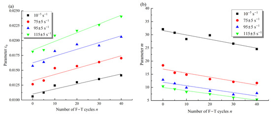 In addition, Figure 19 presents the variation of m and ε0 in the damage evolution model with the F–T action and strain rates. It can be observed that the parameter ε0 is larger under dynamic loading than under static loading, and increases with F–T damage (Figure 19a). As shown in Equation (16), the linear function can describe the change of parameter ε0 with F–T action, and the growth rate increases with the strain rates. In contrast, the parameter m is smaller under dynamic loading than static loading and tends to decrease linearly with the F–T action (Equation (17)). Meanwhile, the decline rate of the parameter m with the F–T action is inversely correlated with the strain rates, i.e., the larger the strain rate, the slower the decline rate. After five F–T cycles, the parameter m increased by 16% from 0.001324 to 0.001559, and the slope from 0.00105 to 0.0001123 when the strain rate was increased from 75 s−1 to 95 s−1 (Figure 19b). As the F–T cycle increases, the strength of the mineral particles and cement in the sample gradually decreases, resulting in a shift in the damage of the rock from brittle to ductile [27]. The damage of the rock also shifts from brittle to ductile under impact loading [10]. The change in damage mode implies a decrease in post-peak stress drop rate; therefore, the parameter m reduces with the F–T damage and loading rate. In addition, the peak strain of the sample increases with increasing F–T damage, and there is a significant strengthening effect of strain rate, so the parameter ε0 increases with the F–T action and strain rate.