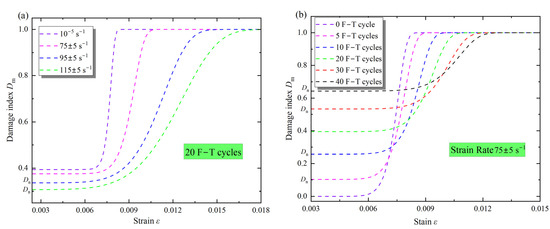 Damage Dm evolution with strain rate (a) and F–T cycles (b) under impact loading.