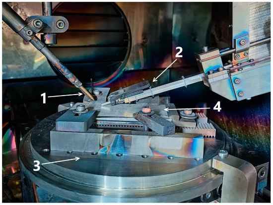 Configuration of the camera of the EBAM machine for printing by a combined method with wire and bar feeding of the material: (1) wire feeder, (2) bar feeder, (3) cooled table, (4) steel substrate.