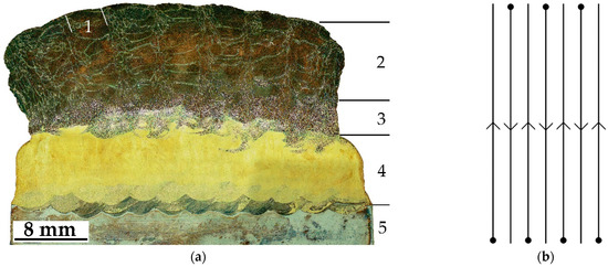 The macrostructure of the obtained samples is depicted in the optical image of the typical cross-section shown in Figure 2a. The sample is fabricated in accordance with the specified printing strategy; therefore, the macrostructure of the cross-section is represented by crystallized melt pools 1 with a width of 3–4 mm (clearly seen in Cu–Al–Mn layers). This is because, in this work, a printing strategy with intermittent application of parallel layers was used (Figure 2b); when between passes, the sample was kept for a short time (10 s corresponding to dots in Figure 2b), required for changing the bar in the feeder, changing the printing track, and cooling the sample. As a result, boundaries were formed between adjacent tracks consisting of smaller grains crystallized at a higher speed. It is also worth noting the transition zone 3 in Figure 2a, formed at the border of the fusion of two bronzes.