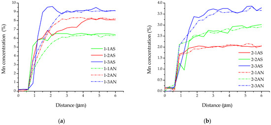 A set of EDX spectra were analyzed from square sections with a side of 250 µm and a step of 250 µm, starting from the substrate and finishing at the upper part of the sample. During the analysis, it was found out that the structure of the samples had a directional gradient of chemical composition (Figure 3). The manganese content depended on the value of the heat input and determined the structure-phase gradient formed in the samples. It is also worth noting the difference in the width of the gradient zone from the Cu–7Al substrate to the Cu–Al–Mn layers. In general, the gradient area could be divided into the following characteristic zones: (i) a zone of a sharp increase in the content of Mn; (ii) a zone of instability; (iii) a zone with a stable content of alloying elements. Annealing after printing significantly affected the structure of the gradient zone, leveling the chemical composition in the transition zone from Cu–7Al to Cu–Al–Mn. On the basis of the EDX analysis data, it was revealed that the pronounced transition zone formed during the printing and characterized by an uneven phase composition, as well as a reduced Mn content, was leveled during annealing, as can be seen in the plots in Figure 3. Due to the temperature treatment, it was possible to homogenize this area; however, in the case of Cu–11Al–9Mn alloy, this led to a blurring of the chemical composition of the transition zone (Figure 3).