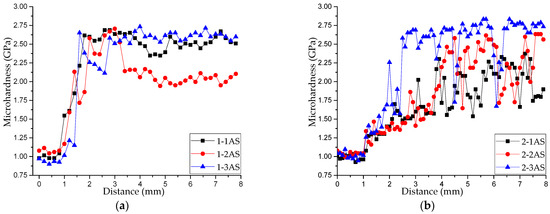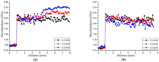 Figure 7 presents the distributions of the microhardness along the height in the annealed samples. As can be seen from these plots, due to microstructural changes caused by annealing, the microhardness of the samples of series 2 and sample 1-1AN was within the same interval of values (2.0–2.4 GPa). This confirms the fact that annealing with quick cooling led to the transition of the structure to the martensitic phase, which can also be seen in Figure 5. Different properties of samples 1-2AN and 1-3AN can be explained by the fact that the transformation to the martensitic phase in them was restrained from the stable, ordered β1-phase.