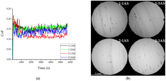 The results of pin-on-disc measurements are presented in Figure 8 and Table 4 for materials in different structural states. AS samples demonstrate a relatively low coefficient of friction in the range from 0.11 to 0.17. At the same time, the friction behavior of AS samples differs slightly among themselves. Because of the large amount of soft α-phase, sample 2-1AS had the lowest CoF, and sample 2-3AS had a CoF value between 2-1AS and samples 1-1AS and 1-3AS. However, all AS samples had a stable friction behavior with a short run-on stage and uniform CoF after process stabilization. The value of wear was also different for different printing conditions; however, in general, it was typical for aluminum bronze [30,31].
