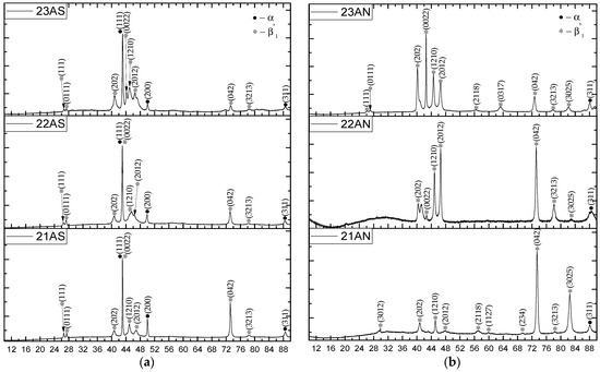 As can be seen from Figure 10, the phase composition of the printed Cu–11Al–4Mn layers strongly depended on the printing regime. Thus, the Cu–11Al–4Mn alloy samples were characterized by a structure with the presence of the following two phases: R18-type martensite and α-phase. The appearance of the α-phase was caused by the eutectoid decomposition, which is typical for bronzes [33,34]. As can be seen from the comparison of SEM images (Figure 4) and XRD diagrams (Figure 10), in the low-heat-input regime, the cooling of the sample was faster and, consequently, less α-phase had time to separate. Accordingly, as evidenced by the high degree of intensity of X-ray peaks, mainly R18 martensite was present in the sample. Samples printed at high heat input values contained much more α-phase since high beam energies during printing contributed to high sample heating. From the XRD diagrams of the samples subjected to annealing (Figure 10b,d,f), it can be seen that the heat treatment allowed them completely transform into the martensitic phase.