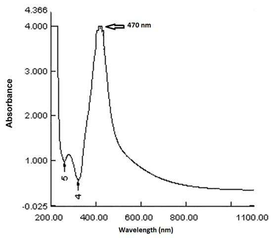 UV-visible spectroscopy was used to examine a colloidal solution of the Ag NPs synthesized by Debregeasia salicifolia leaf extract. Figure 2 depicts the UV-visible spectrum. The absorbance maxima for synthesized NPs in the given spectrum are at 470 nm. The presence of a peak in the 300–500 nm range indicated the synthesis of silver NPs [29].