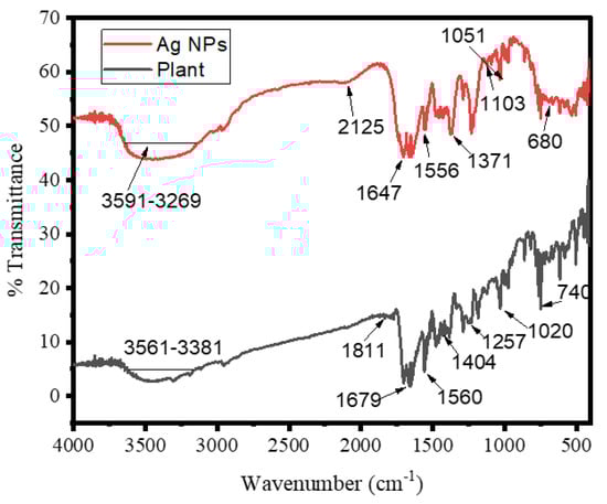 The chemical compositions of the surfaces of silver NPs were probed by using an FT-IR spectroscopy for the capping of bio-reduced Ag NPs generated by leaf extracts and the reduction of Ag+ ions; probable biomolecules that were responsible were identified. Different peaks may be seen in the FTIR spectra of biosynthesized Ag NPs (Figure 3). The peak in the FTIR spectrum at 3591–3269 cm−1 reveals the O-H group in alcohols, phenols, and the N-H stretching vibration of protein amides [28]. The -CC- band of alkynes was responsible for the peak at 2125 cm−1. The -C = C- band of alkenes caused a peak at 1647 cm−1. The C-N stretching vibrations of aliphatic amines might be assigned to the intense band at 1051 cm-1. The FT-IR spectrum also exhibited amide I and amide II bands at 1556 and 1371 cm1, which were caused by carbonyl (C = O) and amine (NH) stretching vibrations in the amide links of the proteins, respectively. The C-O stretching of alcohols and carboxylic acids occurred [29]. CH out of plane-bending vibrations of substituted ethylene systems -CH = CH- had peaked at nearly 680 cm−1. The positions of the absorption bands in the FTIR spectrum of the plant extract and biosynthesized Ag NPs differed only slightly. The presence of the plant extract compounds in the NP production was established by the shifting of peaks. As a result, plant extract molecules containing OH and CO groups are significant in Ag NP reduction and stability [17].