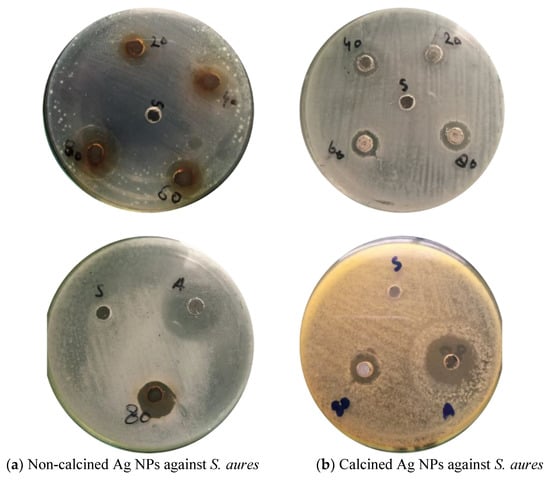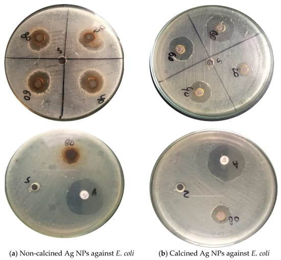 Around each well, the zone of inhibition in millimeters (mm) was measured to check the antibacterial activity of calcined and non-calcined Ag NPs. The inhibitory effects of biosynthesized Ag NPs with four different concentrations (20, 40, 60. and 80 mg) were analyzed, as shown in Figure 6a,b and Figure 7a,b. Bacteria i.e., Gram-positive (S. aures), and Gram-negative (Escherichia coli) were used in the analysis [4,20]. The results show that by increasing the concentrations of suspensions in each well, the antibacterial activities of Ag NPs also increased. The strongest antibacterial activity was observed in the case of non-calcined Ag NPs against (S. aures) Gram-positive bacteria. While in the case of calcined Ag NPs (E. coli), Gram-negative bacteria were found to be the strongest strain. NPs with large surface areas perform specific functions at the surfaces of microorganisms [3] (shown in Table 1).