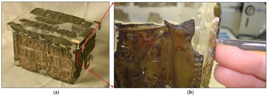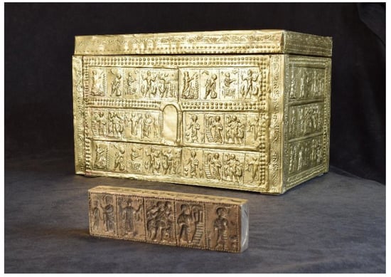 A silver relic decorated with a scene of Christ and the apostles, a silver undecorated relic, a glass vessel and fragments of brass tiles were found in the stone chest. These brass tiles were decorated with various biblical scenes. After an expert examination, it was confirmed that the pieces of brass tiles were, in all probability, the remains of a wooden chest made in the 4th century CE [2]. The analysis showed that this was one of the best preserved archaeological finds of its kind in the world, as one of the biblical scenes depicted Mary, along with a record of her name (Maria). Based on the preserved brass tiles, a reconstruction of the wooden chest (Figure 1a) was made in 1973 by gluing the tiles to a plastic frame. Subsequent archaeological studies in the 1990s have shown that such a reconstruction was not appropriate, as some brass tiles were destroyed (disintegrated), as well as that they were not connected properly into a whole that would represent the original.