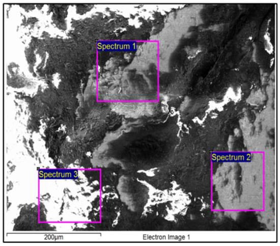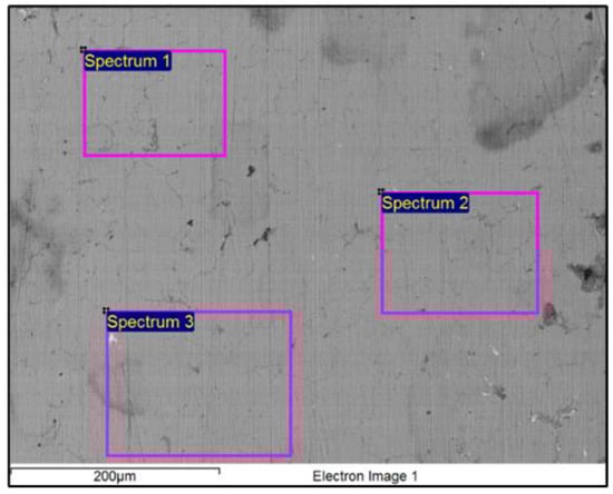 SEM/EDX analysis was performed to identify the chemical composition further and get a better understanding of chemical properties, as well as the brass surface microstructure. First, a microscopic examination of the surface of the dark sample was performed directly without any preparation. The observation showed that the surface was not smooth, and that there were various impurities and defects on the surface (C-contamination, Al2O3 oxides, SiC abrasions, holes, etc.). The cause of the presence of the mentioned substances can be attributed to the oxidation, handling and ageing processes. Figure 3 shows the microstructure of this surface with the locations where the three EDX analyses were performed. A total of 3 × 9 = 27 EDX microchemical analyses were performed at the selected sites so that the results could be processed statistically, as shown in Table 2.