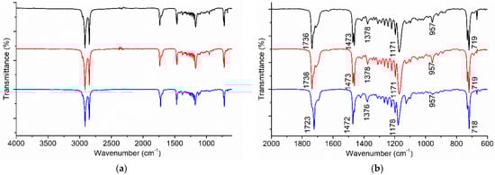 FTIR spectra of adhesive 1 (black), adhesive 2 (red), and commercial beeswax (blue): (a) Full spectra; (b) Region from 2000 cm−1 to 600 cm−1.