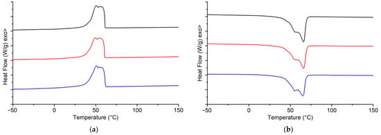 DSC thermograms of adhesive 1 (black), adhesive 2 (red), and commercial beeswax (blue): (a) Cooling run and (b) Heating run.