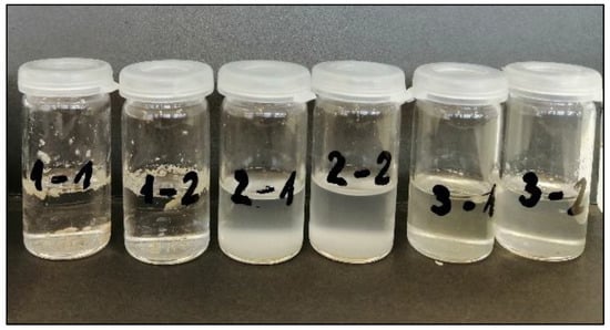 Figure 7 shows vials containing different solvents and adhesive after 5 min of dissolution. The first number represents the solvent used and the second number represents the adhesive used. The pieces of adhesive dissolved in acetone were slightly swollen, but still present after the tested time. On the other hand, it was found that both n-hexane and dichloromethane dissolved the adhesives successfully, but with slight differences in solubility. Dichloromethane dissolved both adhesives fully, as indicated by the clear solution which only contained suspended impurities, while at the tested time, n-hexane dissolved the adhesives only partly, as indicated by the cloudy solution.