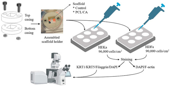 Control and PCL/CA scaffolds were seeded with HDFa and HEKa cells on two plates each having six wells. Specifically, four samples were seeded with HEKa cells (density = 96,000 cells/cm2) on one of the plates and four samples were seeded with HDFa cells (density = 90,000 cells/cm2) on the other plate. In both cases, the cells were allowed 4 days to attach to the scaffolds and 9 more days to proliferate. Table 1 summarizes the well-plate arrangements of the test scaffolds, and Figure 1 shows the roadmap to the in vitro experiments. After a total of 13 days since the instigation of cell seeding, the scaffolds were fixed with 4% paraformaldehyde (Electron Microscopy Sciences, Hatfield, PA, USA) and treated with 0.1% Triton X-100 (Fisher Scientific, Fair Lawn, NJ, USA) and 1% bovine serum albumin (Sigma-Aldrich, St. Louis, MO, USA). The antibody staining was a two-day process. On the first day, the fixed scaffolds with HEKa cells were stained with KRT5 mouse monoclonal antibody (Sigma-Aldrich, St. Louis, MO, USA), cytokeratin 1 (KRT1) guinea pig polyclonal antibody (OriGene Technologies, Rockville, MD, USA), and filaggrin rabbit polyclonal antibody (Invitrogen™, Thermo Fisher Scientific, Pittsburgh, PA, USA) and stored at 4 °C overnight. On the second day, rabbit anti-mouse IgG (H + L) highly cross-adsorbed secondary antibody, Alexa Fluor™ Plus 555 (Invitrogen™, Thermo Fisher Scientific, Pittsburgh, PA, USA), goat anti-guinea pig IgG (H + L) highly cross-adsorbed secondary antibody, Alexa Fluor™ 488 (Thermo Fisher Scientific, Pittsburgh, PA, USA), goat anti-rabbit IgG (H + L) cross-adsorbed secondary antibody, Alexa Fluor™ 633 (Thermo Fisher Scientific, Pittsburgh, PA, USA), and DAPI (MilliporeSigma, Burlington, MA, USA) were added to the fixed scaffolds. Scaffolds seeded with the HDFa cells were only stained with DAPI and F-actin (Alexa Fluor™ 488, Invitrogen™, Thermo Fisher Scientific, Pittsburgh, PA, USA) on the second day. Cell attachment, proliferation, infiltration depth, and differentiation were studied with a laser scanning confocal microscope (Carl Zeiss Microscopy, Oberkochen, Germany). Table 2 summarizes the antibodies and the dilution/concentration used in the present study.