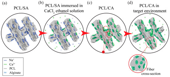 Schematic illustration of the leaching out process of the Ca2+ ions. (a) As-fabricated PCL/SA scaffold, (b) scaffold immersion in a CaCl2 ethanol solution triggers three different processes—calcium diffusion into the scaffold, sodium leaching out from the fibers, and calcium alginate acting as a crosslinker resulting in (c) a scaffold consisting of only PCL/CA fibers, which in the target environment (d) demonstrates Ca2+ ion leaching out from its surface and the bulk of the fibers.