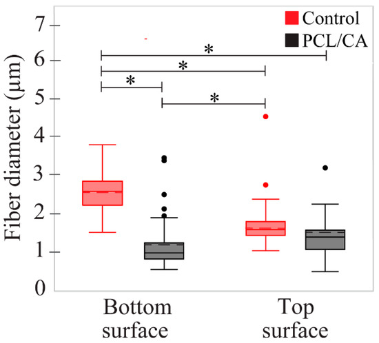 Statistical results of the fiber diameter at the top and bottom surfaces of the control and PCL/CA scaffolds. The dashed lines inside the boxes represent the means of each dataset. (*) Indicates a statistically significant difference with a confidence level of 95% (p < 0.05).