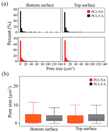 Figure 5 shows the results of the estimated pore size at the bottom and top surfaces of the uncrosslinked PCL/SA and crosslinked PCL/CA scaffolds. The pore size distribution plots (Figure 5a) revealed slightly smaller pores at the bottom surfaces than the top surfaces of the PCL/SA and PCL/CA scaffolds. The fact that crosslinking contributed to the formation of additional pores is evidenced by the slightly higher percentage of small pores in the distribution plots (Figure 5a) and the slightly narrower dataset, particularly at the bottom surface of the PCL/CA scaffold (Figure 5b). However, there was no statistically significant difference between the pore size means (p > 0.05) of the bottom and top surfaces of the PCL/SA and PCL/CA scaffolds (Figure 5b). The apparent decrease in pore size may be attributed to the fact that the relatively thinner fibers at the bottom surface of the PCL/CA scaffolds increased both the surface area and the number of crosslink sites, also contributing to the fiber fusion and entanglement.