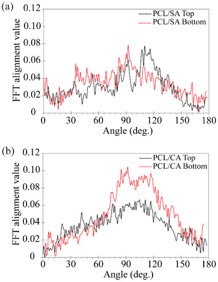 The fiber morphology of the PCL/SA and PCL/CA scaffolds was further studied with a modified FFT technique. While the PCL/SA scaffold surfaces did not demonstrate a dominant direction of fiber alignment (Figure 6a), the PCL/CA scaffolds revealed that the crosslinking process yielded a more ordered morphology characterized by planar fiber alignment, especially at the bottom surface (Figure 6b). The wide distributions of fiber alignment indicate that there is not a specific angle of alignment in the PCL/CA scaffolds, but a wide range of alignment directions.