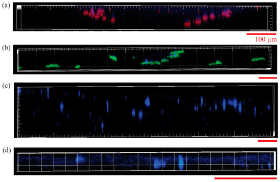 Confocal microscope images showing the infiltration of HEKa cells seeded onto (a) control and (b) PCL/CA scaffolds, and HDFa cells seeded onto (c) control and (d) PCL/CA scaffolds (KRT1 (green), KRT5 (red), filaggrin (purple), and DAPI (blue)). All scale bars correspond to 100 µm and are applicable for the horizontal and vertical axes of the images. The antibodies shown in (a,b) do not indicate exclusivity of expression; these images are only used to visualize the infiltration depth.