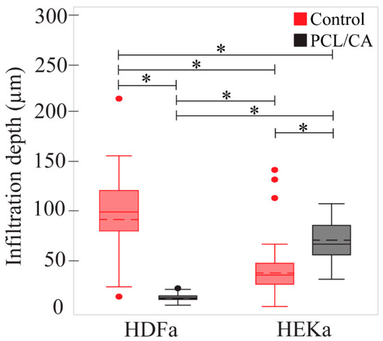 Statistical results of the infiltration depth of the HDFa and HEKa cells through the control and PCL/CA scaffolds. The dashed lines inside the boxes represent the means of each dataset. (*) Indicates a statistically significant difference with a confidence level of 95% (p < 0.05).