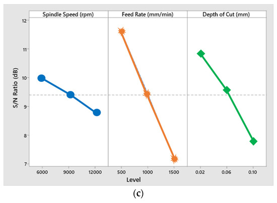 - The Taguchi method optimized parameters in this experiment plan are high spindle speed, low feed rate, and low radial depth of cutting.