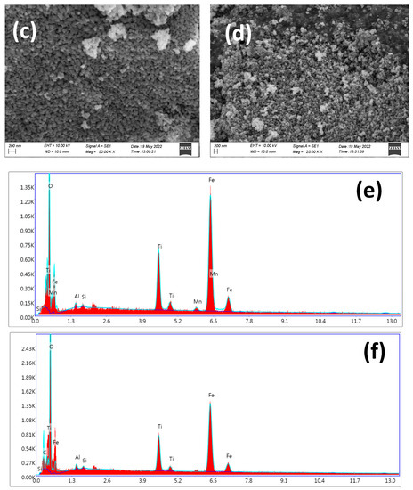 The dissolution of ilmenite sand by hydrochloric acid produces iron and titanium chlorides as expressed in Equations (2)–(5). The ICP-MS quantified total Fe3+ and Ti4+ concentrations of oxygenated acid leachate, which were 5434 mg/L and 1078 mg/L, respectively. During bubbling of oxygen gas, all Fe2+ in acid leachate was oxidized and produced Fe3+. Hence, the total Fe concentration recorded by the ICP-MS analysis represents only Fe3+. The molar ratio of Fe2+ to Fe3+ was adjusted to 1:2 by adding 0.0237 mol of FeSO4.7H2O to the acid leachate under nitrogen environment. The amorphous TiO2/Fe3O4 composite after drying the precipitate obtained from the reaction of NH4OH and the acid leachate is shown in Equations (6)–(10). The XRD patterns of ilmenite sand and amorphous TiO2/Fe3O4 composite are shown in the supplementary information, specifically Figure S1a,b.