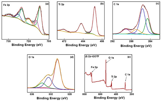 X-ray photoelectron spectroscopy (XPS) emerged as a more surface-sensitive approach to describe the surface chemical states of fabricated nanocomposites. The higher resolution spectra of the elements and survey spectra of the synthesized composites are shown in Figure 3. All binding energies were corrected for the sample charging effect considering the binding energy of sp2 hybridized C=C as 284.6 eV. The higher resolution spectrum of Fe 2p of (0.3)r-GOTF is shown in Figure 3a while that of other composites are given in Supplementary Figure S2. The higher resolution spectrum of Fe 2p was mainly deconvoluted into two peaks as 2p3/2 and 2p1/2 and this generally indicated the spin orbital coupling. The peaks correspond to Fe 2p3/2 of the nanocomposite materials that appeared in the 711.84–712.06 eV range and the peak corresponding to Fe 2p1/2 appeared in the range of 725.28–726.03 eV, respectively [57]. The calculated binding energy differences are in the 13.64–13.73 eV range and satisfy the spin-orbit splitting of Fe 2p because Fe(III) is usually high-spin and exists in the form of Fe3+ [58]. The chemical environments of Fe3+ in α-Fe2O3 and Fe2TiO5 are different, although the oxidation number is the same. It can be observed that the resultant binding energies differ from those of the pure compounds, demonstrating the effective fabrication of Type II heterojunctions in the binary composites and altering the electronic environment of an individual element [59].