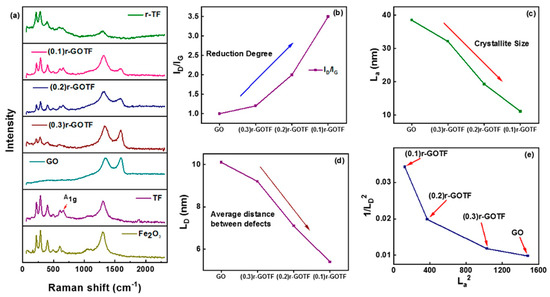 As demonstrated in Figure 4c, the La values of all GO-based composites improved as the reduction increased. This finding suggested that the average crystalline size of graphitic domains diminished when increasing the loading of GO. A similar pattern was seen with LD (Figure 4d). Both the variations of La and LD support the observation made with the variation of the ID/IG ratio. Furthermore, Figure 4e depicts the variations in the density of the 0D defects (1/LD2) as a function of the crystallite area (La2) of (0.3)r-GOTF, (0.2)r-GOTF, and (0.1)r-GOTF composites. The number of 0D defects declines as the crystallite area expands, i.e., with decreasing GO loading, which is consistent with the behavior predicted by the variation of ID/IG.