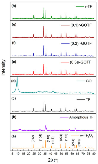 The XRD pattern of GO (Figure 2b) shows a sharp peak at 9.39° corresponding to the (001) atomic plane of graphene oxide [68]. The average crystalline size of the nanoparticles was calculated by the Debye-Scherrer Equation (14), and interlayer distance was calculated by Bragg’s Equation (15) [69]. The interlayer distance of GO was calculated as 0.94 nm and the crystallite size was found to be 7.13 nm; it consists of approximately 7 graphene layers. The XRD patterns of (0.3)r-GOTF, (0.2)r-GOTF and (0.1)r-GOTF are shown in Figure 5e–g, respectively, and appear to be identical to the XRD pattern of α-Fe2O3. The diffraction peaks corresponding to GO were not present because the folded structure of GO disappears during the ascorbic acid reduction, while the restacking of the nanosheets was observed when α-Fe2O3 nanoparticles are incorporated into r-GO sheets. The diffractions for the (012), (104), (110), (113), (024), (116), (214) and (300) crystalline planes of α-Fe2O3 were clearly observed with only a slight variation in diffraction angles [32,39].