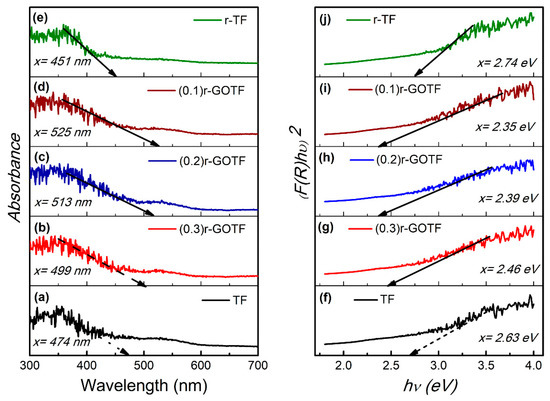 Adsorption vs. wavelength plot for (a) TF, (b) (0.3)r-GOTF, (c) (0.2)r-GOTF, (d) (0.1)r-GOTF and (e) r-TF, and direct band gap (n = 2) for (f) TF, (g) (0.3)r-GOTF, (h) (0.2)r-GOTF, (i) (0.1)r-GOTF and (j) r-TF.
