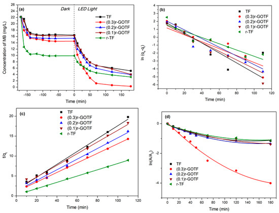 The visible light-driven photodegradation of fabricated nanocomposites was evaluated using MB. Experimental conditions were performed accordingly: catalyst loading (W = 50 mg), initial concentration of MB (C0 = 20 mg/L), volume of MB solution (V = 50 mL), temperature (T = 25 °C) and pH = 7. The adsorption of MB to the nanocomposites was evaluated for 180 min dark conditions and the photocatalytic activity was determined for 180 min under exposure to visible light. Adsorption-desorption equilibrium was reached within the first 100 min. Adsorption capacities obtained for TF, (0.3)r-GOTF, (0.2)r-GOTF, (0.1)r-GOTF, r-TF are 5.7, 7.7, 6.8, 6.0 and 12.4 mg/g, respectively as tabulated in Table 5. The overall adsorption and photocatalytic degradation process is shown in Figure 7a. The kinetics parameters of the pseudo-first-order and pseudo-second-order dark adsorption model are tabulated in Table 5. The best fitting model was chosen based on the linear regression correlation coefficient (r2) values. Equations (18) and (19) were used to express the linear form of the pseudo-first-order and pseudo-second-order adsorption kinetic models, respectively, and the respective plots are shown in Figure 7b,c [72,73]. It can be concluded that the adsorption of MB molecules to the composites follows the pseudo-second-order model as depicted by the higher correlation coefficient (r2) value (Table 5). The calculated values matched the experimental values very well. This finding suggests that physical adsorption dominates the adsorption of MB dye molecules onto the composite surface: