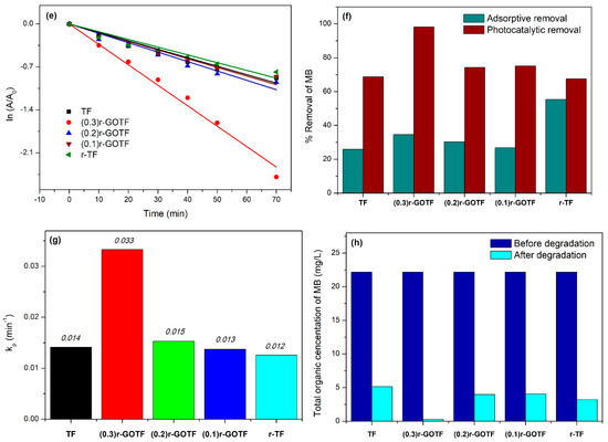 As shown in Figure 7e, the highest rate for the photodegradation of MB (0.033 min−1) was found with (0.3)r-GOTF because of the simultaneous adsorptive and photocatalytic mechanism, whereas r-TF degrades the slowest due to the creation of defective domains in the crystal lattices in α-Fe2O3. The impact of the defective domain formation effect during the ascorbic acid reduction of TF has been further explained in the Raman (Section 3.3) and XRD (Section 3.4) discussions. The calculated initial degradation rate constants of TF, (0.3)r-GOTF, (0.2)r-GOTF, (0.1)r-GOTF and r-TF were determined as 0.014, 0.033, 0.015, 0.013 and 0.012 min−1, respectively (Figure 7e). The rate constant of (0.3)r-GOTF is double that of (0.2)r-GOTF. Figure 7f exhibits the elimination of MB through the adsorption and photocatalysis employing various photocatalysts. MB was effectively removed via adsorption by all the catalysts in which r-TF dominated the activity (55.27%) and the catalysts’ performance varied as follows: r-TF ˃ (0.3)r-GOTF ˃ (0.2)r-GOTF ˃ (0.1)r-GOTF ˃ TF.