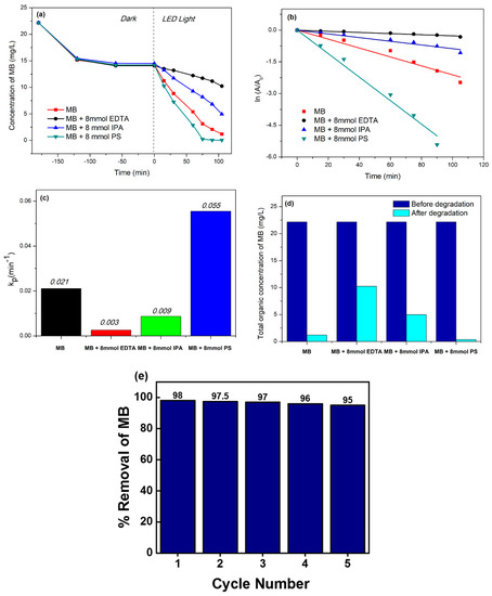 Figure 7d,e show the kinetic parameters of MB degradation as a function of irradiation time exposed to a 1240 Wm−2 LED light (580 nm) source. Figure 7d indicates the overall degradation process as a second-order polynomial arrangement with two independent slopes for the complete degradation. Table 6 depicts the equations used to calculate polynomial regression and polynomial regression coefficient values. The polynomial regression coefficient values fitted the experimental data of the photodegradation process. The proposed mathematical arrangement clearly demonstrated that the degradation process was followed by a second-order polynomial fit with two intermediate rates determining elementary reactions. The first 70 min of the degradation process displayed a linear variation, establishing a starting rate slope for the total process. Despite this, the remaining 110 min slowed down the deterioration process by producing a second slope for the total degradation. This was due to the production of intermediate pollutants. Figure 7e depicts the photodegradation of MB over the first 70 min, and the estimated linear regression coefficients and rate constants are tabulated in Table 6.