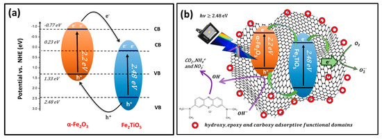 During the past decade, 2D graphene-like r-GO has been used in many areas such as electronics, photonics, supercapacitors, and fluorescence quenching in biology-related fields, biomedicine, catalysts and batteries [41,42,43,44]. The three primary synthetic techniques for GO preparation are the Brodie, Staudenmaier, and Hummer processes and their modifications [45,46]. The improved Hummers technique is employed in this study because it incorporates oxygen as oxygenated functional groups into the graphene structure, for example epoxy, hydroxy and carboxy. As well, their polar properties make GO hydrophilic, dispersed and exfoliated in many solvents. Such produced GO coupled to Fe2TiO5/α-Fe2O3 and the resulting composite was reduced by ascorbic acid to fabricate Fe2TiO5/α-Fe2O3/r-GO/GO heterogeneous photocatalyst composite from natural ilmenite and graphite. The photocatalytic activity of the synthesized nanophotocatalyst was examined to assess the degradation of methylene blue under visible light.