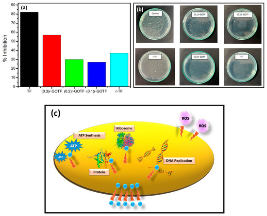 The antibacterial activities of TF, (0.3)r-GOTF, (0.2)r-GOTF, (0.1)r-GOTF and r-TF composites were evaluated using the macro broth dilution method. The susceptibility assay of the synthesized material was carried out against E. coli in sterilized nutrient broth media. The viable count of E. coli bacteria was determined by the standard plate count method to clearly and easily discriminate the viability of bacterial cells after the treatment with fabricated nanocomposites. Bacterial culture and without nanocomposite functioned as the control.