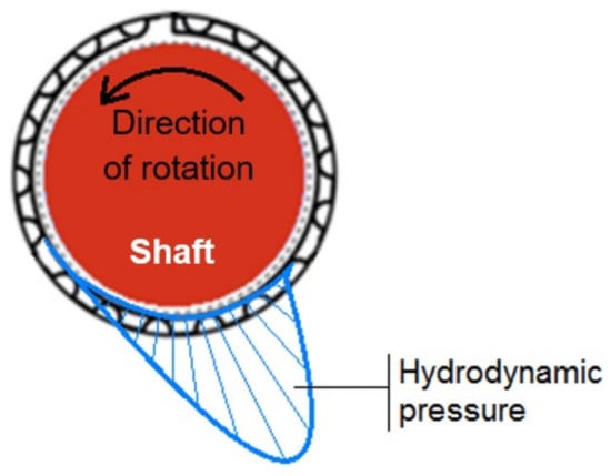 The most characteristic component of a GFB is a group of thin foils that form a compliant structure with variable geometry. When the shape of the top foil, supported in many small-sized areas by the bump foil, is adjusted to the current position of the journal, the load is transferred to a large area, and the unit pressures are low. When the bearing is working and the journal rotates at a certain speed, it is lifted by a gaseous lubricating film, which is formed due to the hydrodynamic effect. Thus, above a certain speed (called the “lift-off speed”), the journal is no longer in direct metal-to-metal type contact with the top foil and no wear occurs in the bearing. Figure 2 shows an example of a hydrodynamic pressure profile that develops during the operation of a GFB. For clarity, this profile does not consider local changes in the locations of top foil support regions.