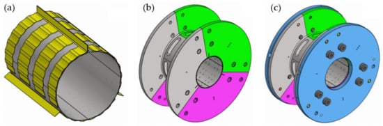 CAD model of the developed prototype a GFB: (a) top foil (seen as the inner grey cylindrical component) covered by the set of three bump foils (marked in yellow), (b) spool-shaped bushing composed of joined tierces (visualized with three different colors), (c) complete assembly equipped with two side flanges (marked in blue).